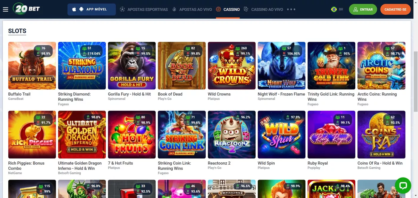 Agora, confira alguns dos principais slots do 20Bet. Além de citar os jogos, também apresentaremos as provedoras e a taxa de RTP (Retorno ao Jogador) de cada um deles: