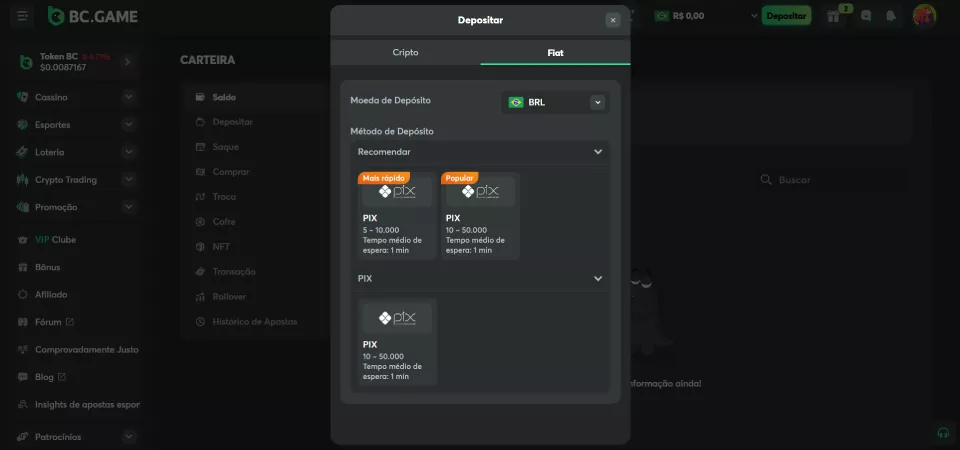 Em geral, o BC. Game aceita duas modalidades de pagamento: em criptomoedas ou no Pix. Ao clicar em Depositar, serão automaticamente mostradas as opções de criptos, então é necessário clicar na opção Fiat para ver a opção do Pix.