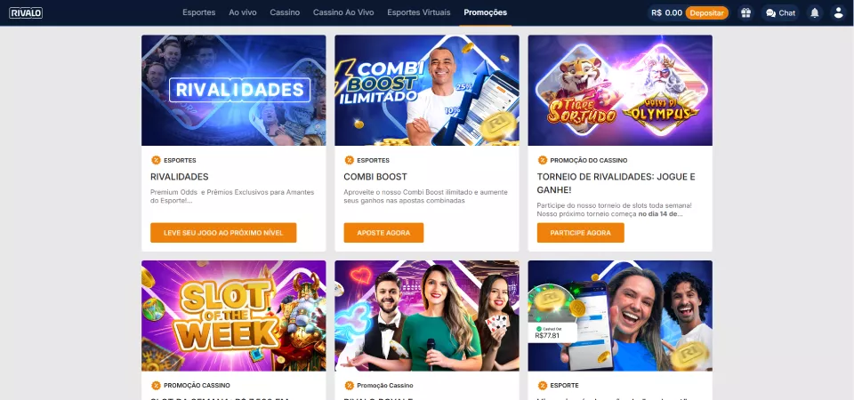 Acesse o Rivalo através de nosso link para aproveitar bônus exclusivos. Navegue pelo site para ir conhecendo a plataforma.