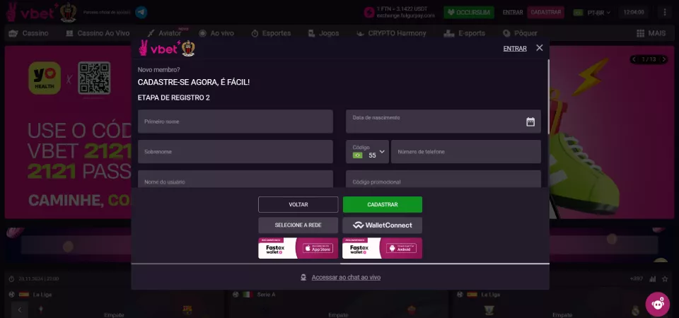 Agora nesse passo de como se registrar no Vbet Casino, clique no botão de cadastro e preencha seu e-mail e senha, além dos demais dados solicitados e clique em “próximo”. Certifique-se de preencher com dados válidos e reais. Nome, CPF, endereço, etc.